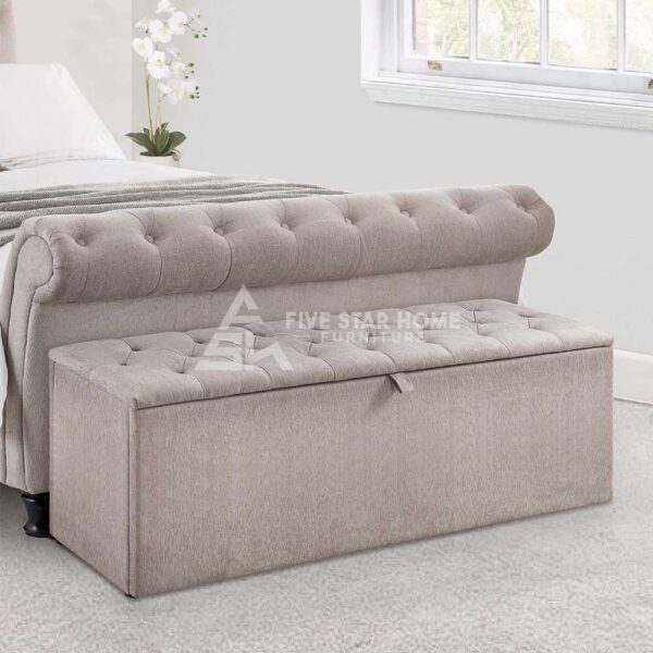 The neatly finished deep buttoning detail adds a touch of sophistication, making it an ideal accompaniment to the Ravello Bed or any other luxurious home decor. Get your hands on this cozy yet chic blanket box and add a touch of elegance to your living space!